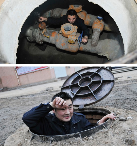 簡單的午餐過后,胡站長開始了閥門井的巡視工作。當掀開位于濟陽大街的主管道井蓋時,一股熱浪襲來。“井內溫度達到46度,到這里面就如同洗桑拿浴”胡站長開玩笑說。等他從6米多深的管道井中上來時,一頭的汗水。大的管道井雖然熱,但是內部空間比較大,維修保養(yǎng)還比較容易,眾多小區(qū)開發(fā)商自行建設的小管道井才是工作中的挑戰(zhàn),空間狹小,工作人員只能用特殊地體位更換閥門。