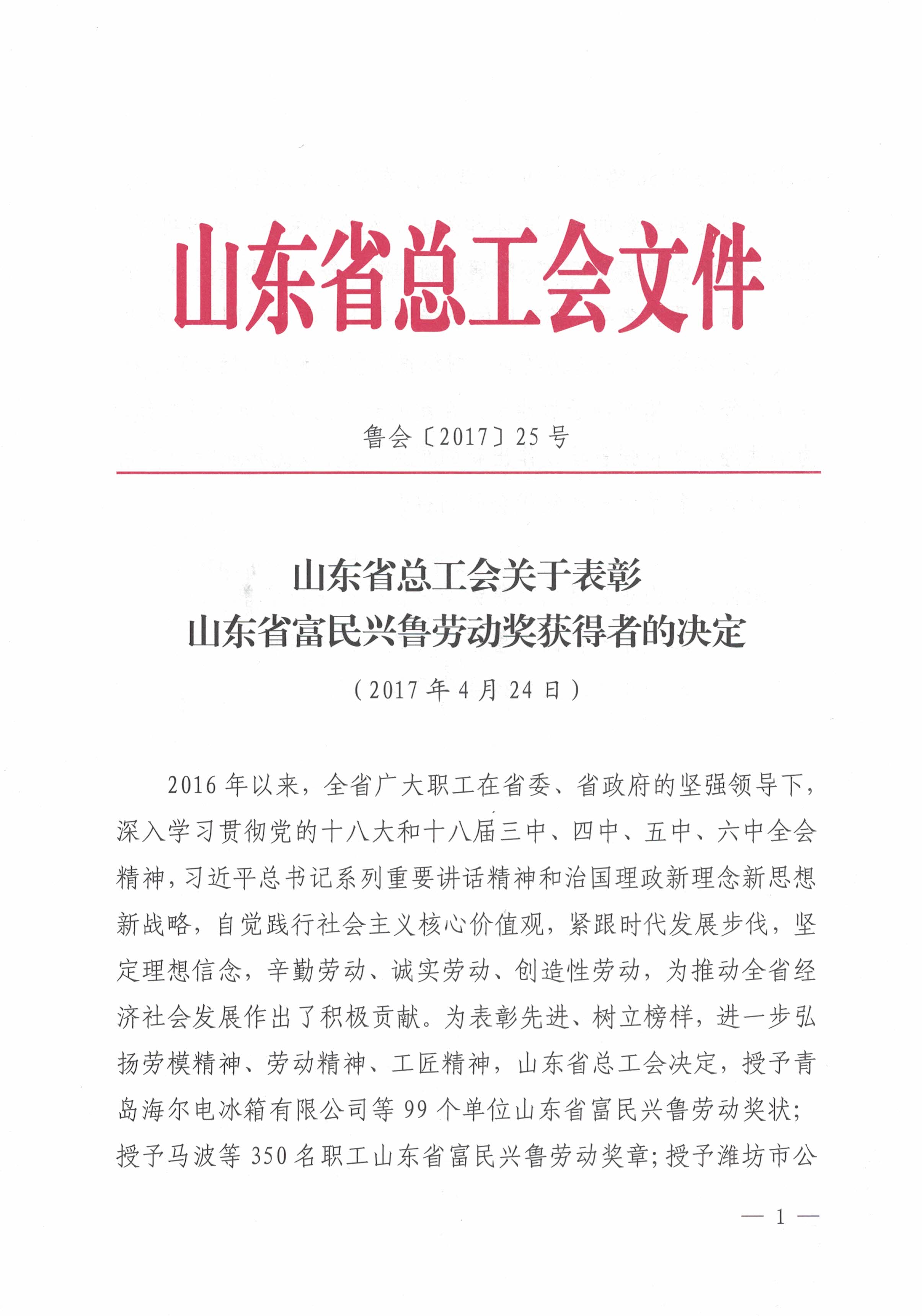 據(jù)了解,“富民興魯勞動獎狀”是山東省總工會組織評選的先進集體獎項,旨在激發(fā)各單位自覺踐行社會主義核心價值觀,緊跟時代發(fā)展步伐,堅定理想信念,辛勤勞動、誠實勞動、創(chuàng)造性勞動,為推動全省經(jīng)濟社會發(fā)展作出積極貢獻,最終為實現(xiàn)“十三五”規(guī)劃目標任務和全面建成小康社會建功立業(yè)。