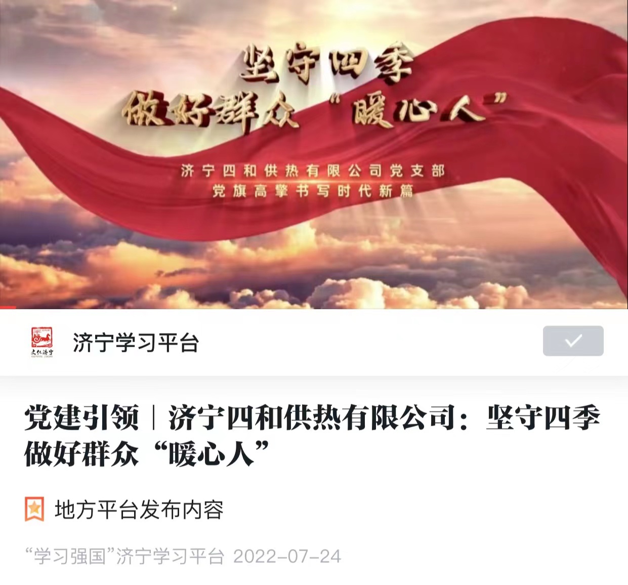 濟(jì)寧四和供熱有限公司黨支部微視頻《我和我的支部》榮登“學(xué)習(xí)強(qiáng)國(guó)”平臺(tái)展播