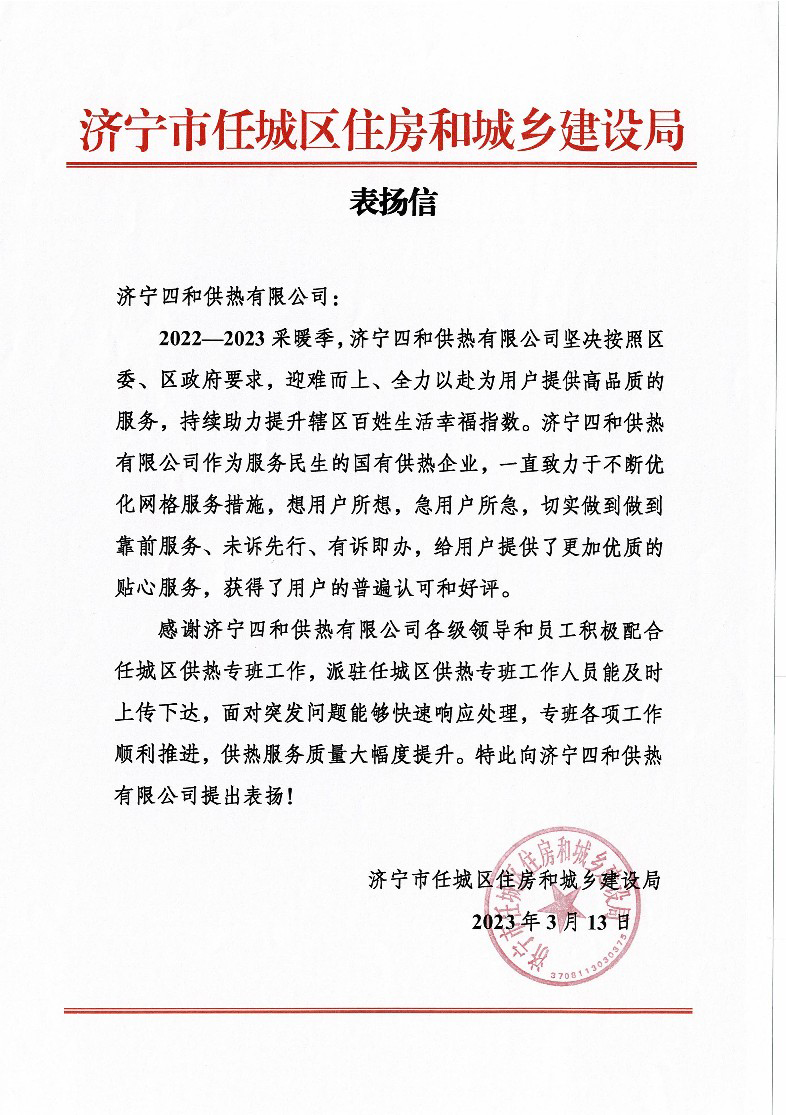 近日,濟(jì)寧市任城區(qū)住房和城鄉(xiāng)建設(shè)局向濟(jì)寧四和供熱有限公司發(fā)來表?yè)P(yáng)信,對(duì)公司積極響應(yīng)區(qū)委、區(qū)政府的號(hào)召,勇于承擔(dān)保障供熱、服務(wù)民生的社會(huì)責(zé)任,千方百計(jì)克服困難,全力以赴提高供熱服務(wù)質(zhì)效,持續(xù)助力提升轄區(qū)百姓生活幸福指數(shù)提出表?yè)P(yáng)。